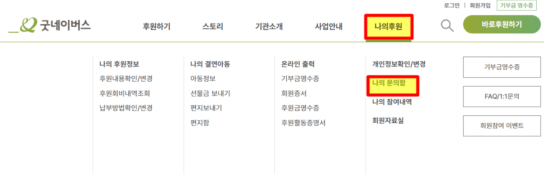 • 로그인 후, 홈페이지 상단 메뉴에서 [나의 후원]을 클릭하고, [나의 문의함]을 선택합니다.