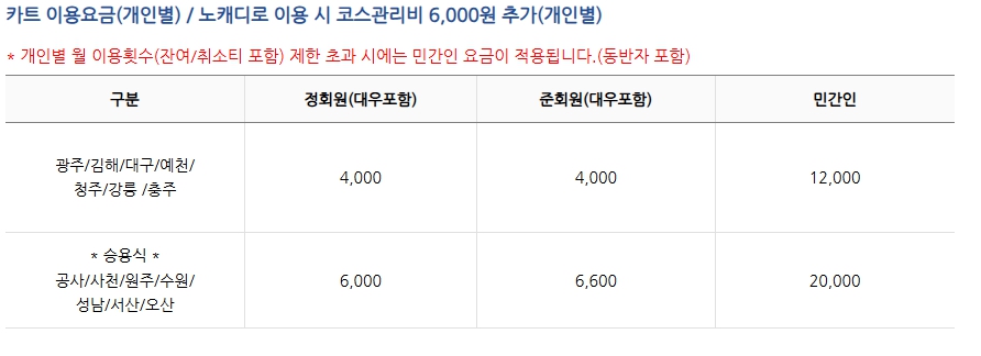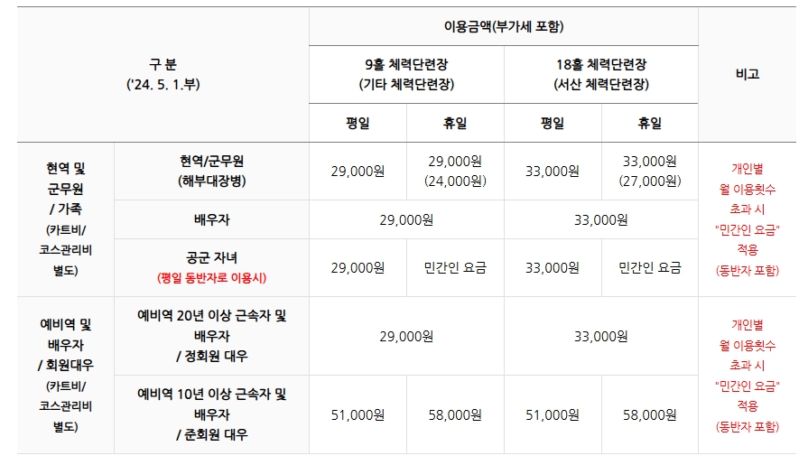 군장병 정회원의 경우 9홀, 18홀 요금이 설정되어 있으며, 민간인은 지역별로 다르게 적용됩니다.