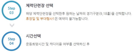 ▪ 예약 신청: 로그인 후 '예약/조회' 메뉴에서 예약 신청을 진행합니다. 예약할 체력단련장을 선택하고, 원하는 날짜와 시간, 경기 구분(9홀 또는 18홀)을 선택합니다.