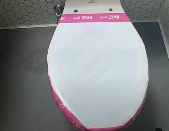 먼저, 비닐이나 랩으로 변기 윗부분을 완전히 밀봉하여 공기가 새어나가지 않도록 하고 테이프로 꼼꼼하게 붙여 줍니다.