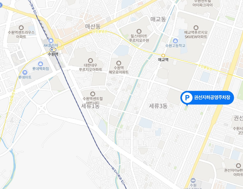 권선 지하 공영 주차장은 매교역 2번 출구에서 900m 정도 거리에 위치한 주차장으로 역에서부터 거리는 조금 있는 편입니다.