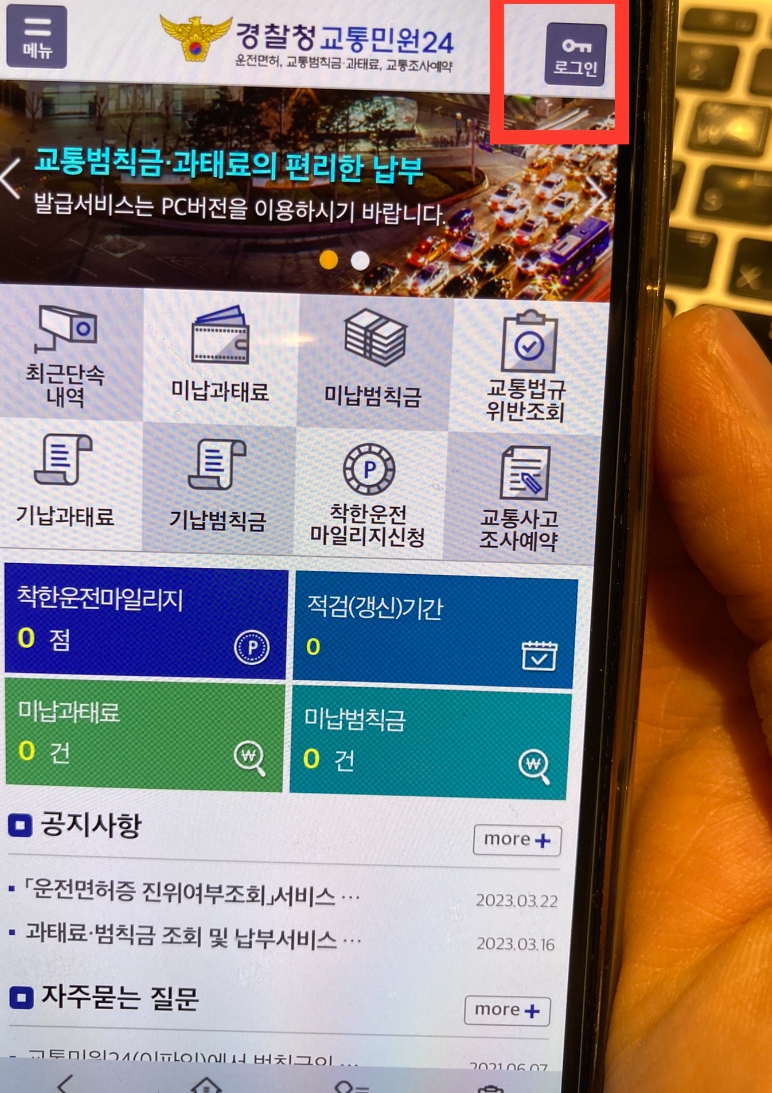 스마트폰에 교통민원 24 앱을 설치하거나 모바일 웹 브라우저를 통해 이파인 홈페이지에 접속합니다.