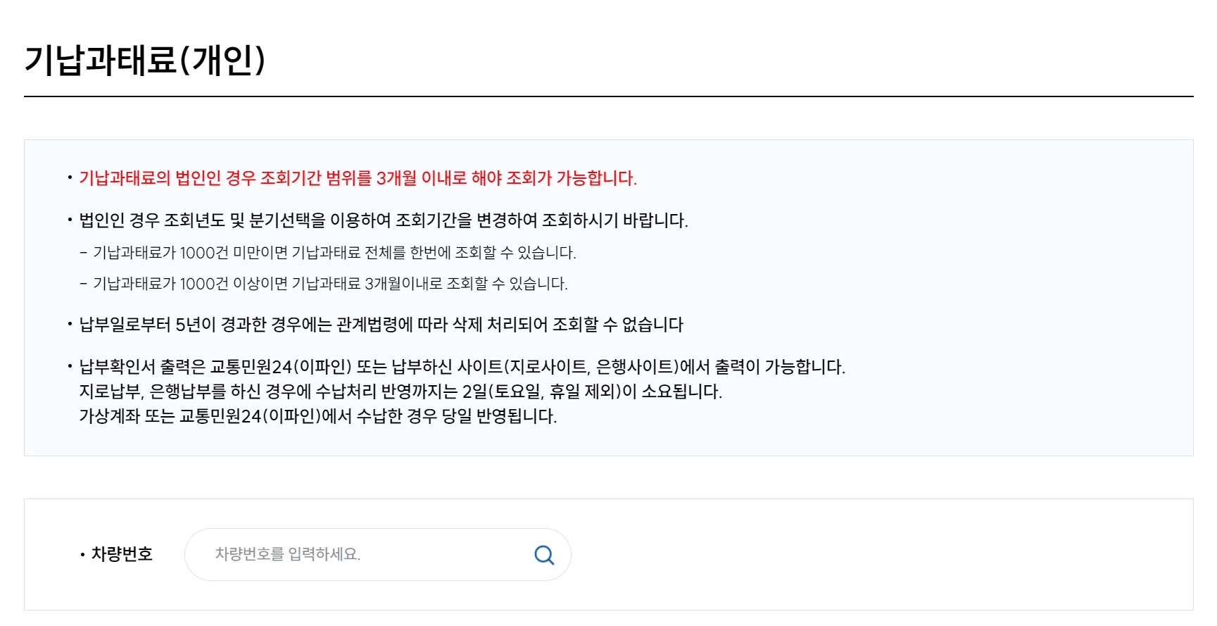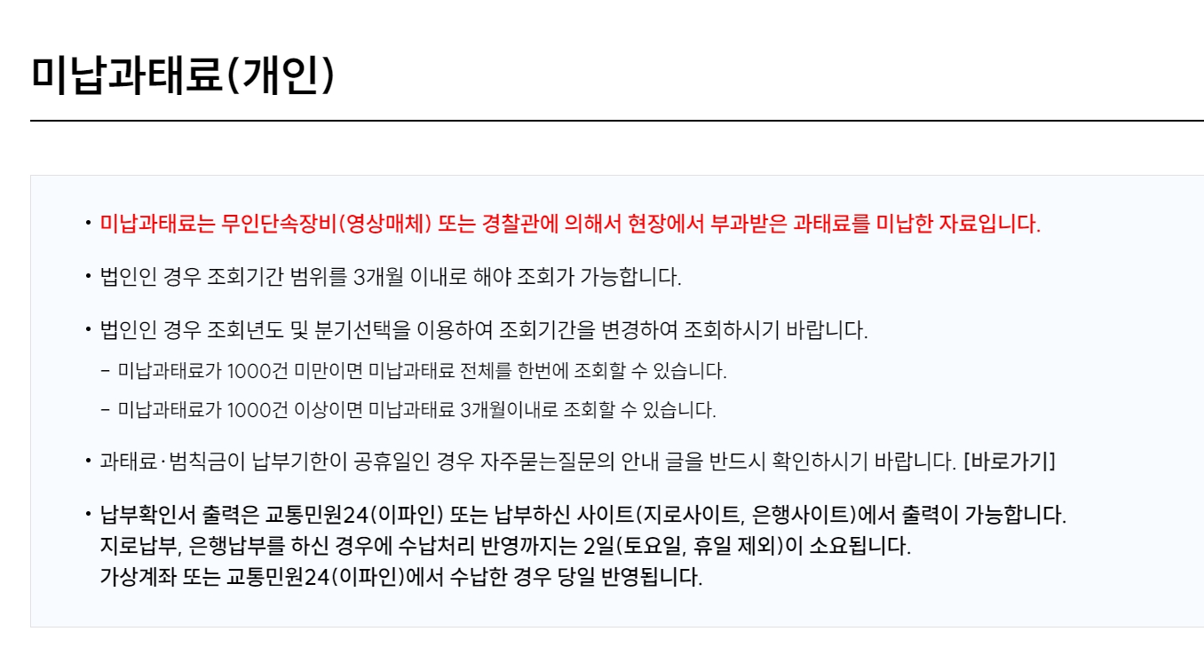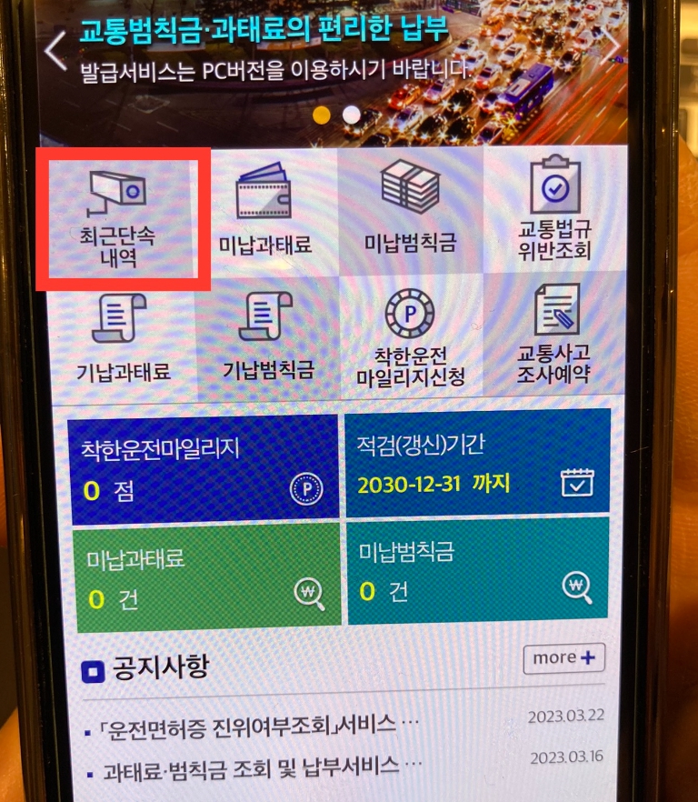 로그인 후, 과태료 및 최근 무인 단속내역 조회를 통해 신호위반 내역을 살펴볼 수 있습니다.