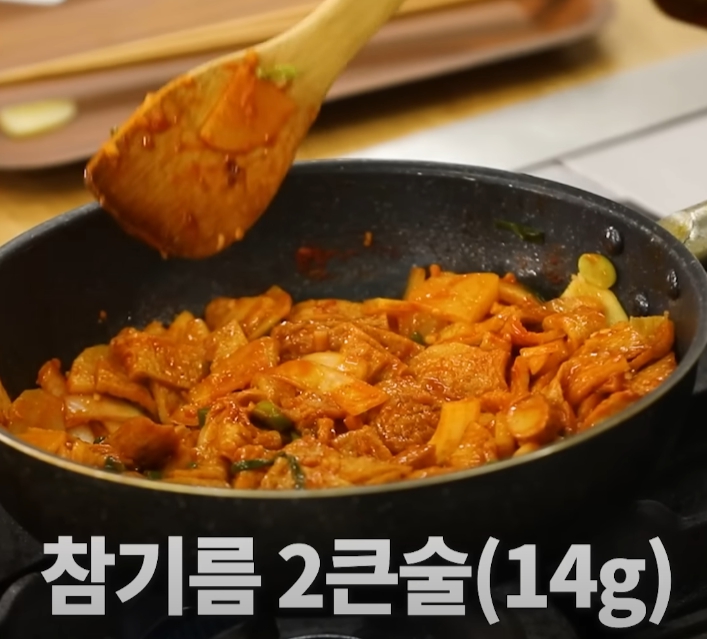 마지막으로, 볶음이 거의 완성되었다면 참기름을 넣어 마무리합니다.