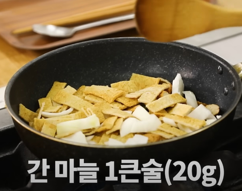 - 볶기 시작: 깊은 프라이팬에 준비한 어묵, 양파, 대파, 청양고추, 감자, 식용유, 간 마늘을 한번에 넣고 강불에 올린다.