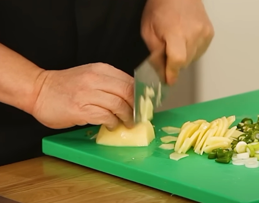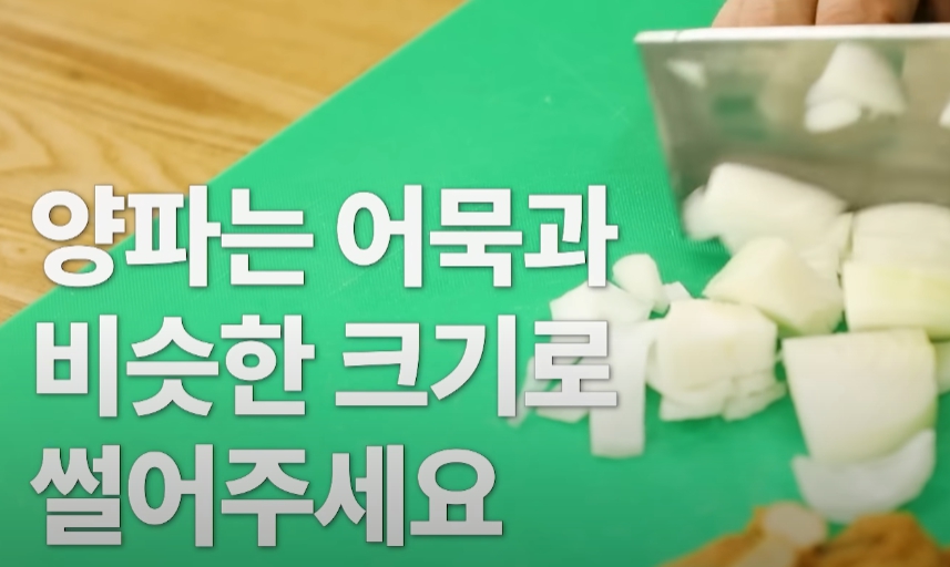 양파는 볶음 요리에 풍미를 더해주는 필수 재료죠. 채소는 어묵과 비슷한 크기로 썰어주는 것이 좋습니다.