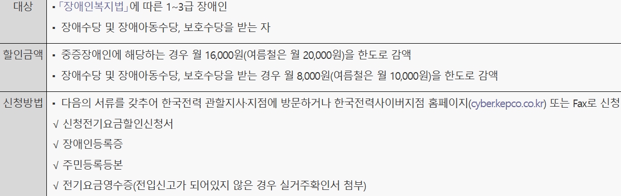 중증 장애인의 경우 월 최대 16,000원의 전기요금 감면 혜택을 받을 수 있으며, 여름철인 6월부터 8월까지는 최대 20,000원까지 감면됩니다.