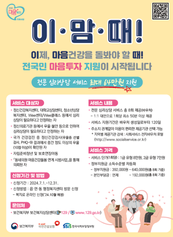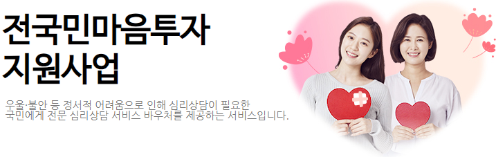 전국민 마음투자 지원사업은 우울, 불안 등 정서적 어려움으로 인해 심리상담이 필요한 국민에게 전문 심리상담 서비스 바우처를 제공하는 프로그램입니다. 이 사업의 주요 목적은 정서적 어려움을 겪고 있는 국민들에게 심리상담 서비스를 제공하여 마음 건강을 돌보고, 정신질환의 사전 예방 및 조기 발견을 돕는 것입니다.