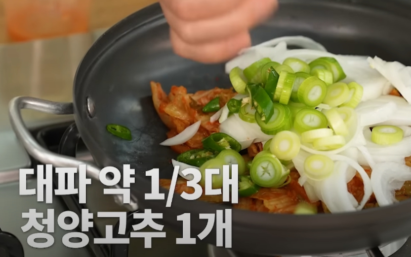 냄비에 준비한 김치를 넣고, 양파와 대파, 청양고추를 추가합니다.