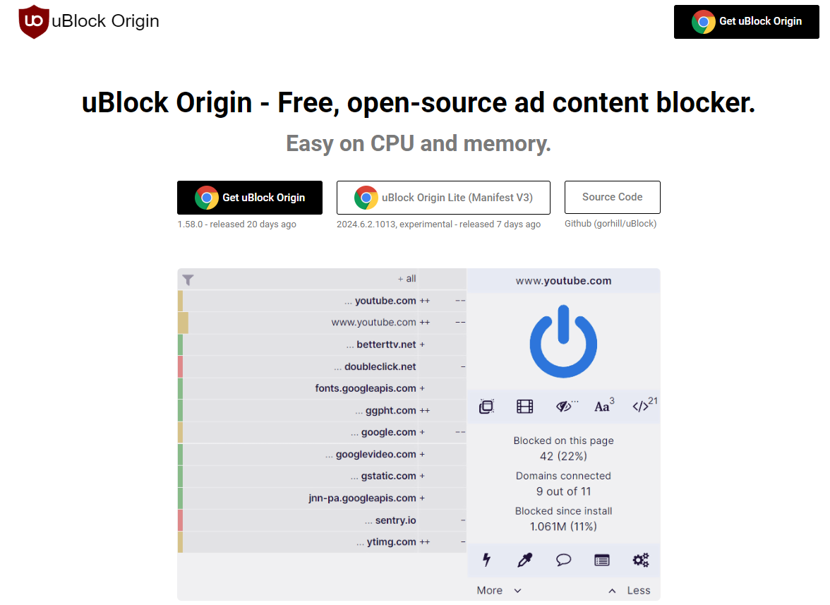 경량화된 광고 차단기며, 시스템 자원을 적게 사용하면서도 효과적으로 광고를 차단합니다. 여러 브라우저에서 지원됩니다.