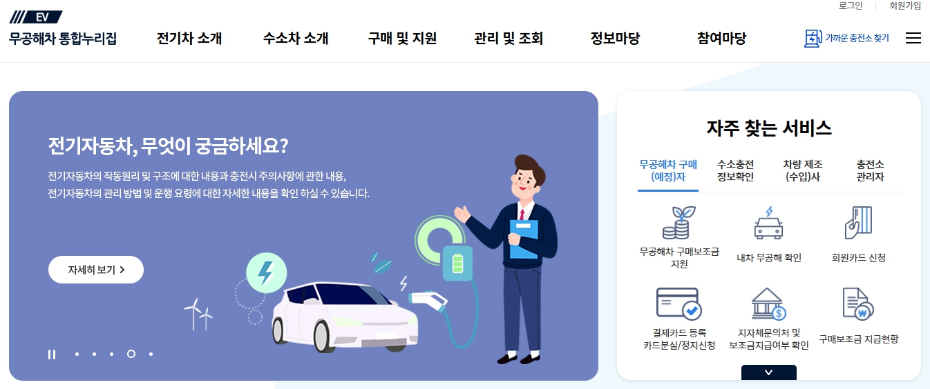 이곳에서는 전기차와 수소차 이용에 필요한 모든 정보를 손쉽게 확인하고, 보조금 신청과 충전소 이용 등을 간편하게 처리할 수 있습니다.
