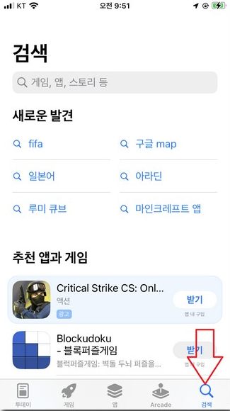 - 상단 “앱 및 게임 검색” 메뉴를 터치합니다.